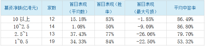 我们按照募资净额大小,分成了四组并对家数、首日表现、中签率情况进行了统计。