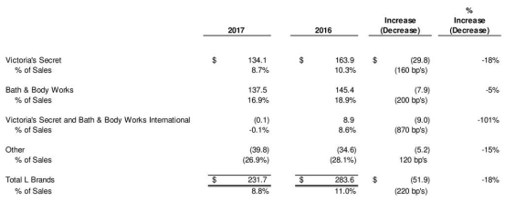 产品种类包括了女士内衣、文胸、内裤、泳装、休闲女装、女鞋、化妆品及各种配套服装、豪华短裤、香水化妆品以及相关书籍等。收入主要来自维多利亚的秘密、BBW(美体护肤产品)以及国际业务。