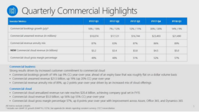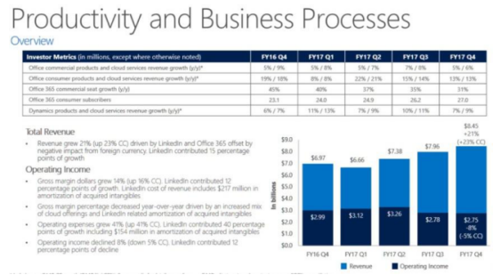 2017财年,微软调整后营收同比增长5%。公司通过成本控制和股票回购使每股收益同比增长19%。2017财年第四季度业绩表现出色,营收同比增长10%,调整后美股收益同比大增40%。