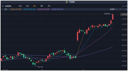 因为黑五喜人的销售表现,亚马逊股价持续攀升,周五上涨2.58%,再度创造历史新高,股价达到1186美元,总市值已经达到5715亿美元。