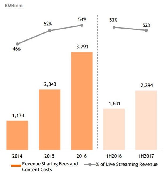 注意到yy的分成和内容成本从2014年的46%攀升到54%,不过该数字到今年上半年就有所放缓。