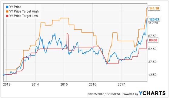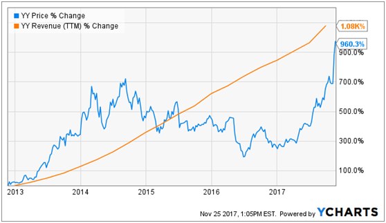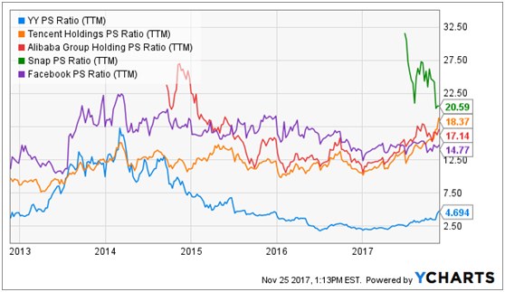 尽管涨了这么多,yy的PS仍然停留在4.7倍,相比之下,像FB,阿里巴巴,腾讯的PS从14.8到18.4不等,而snap的PS高达20.6倍。
