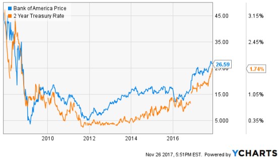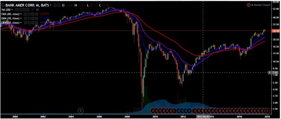 经历了金融危机的低点后,美国银行(NYSE: BAC)股价在过去十年中逐渐回升。2016年美国大选结果出炉后更是一度大涨突破20美元,当时投资者预期各大银行都将从特朗普承诺上任后将实行的政策中获利。美国银行在美国的业务规模庞大,同时受益于美联储加息,公司股价有望继续上涨。从美国银行目前的股价表现来看,未来几年有可能会达到40美元。