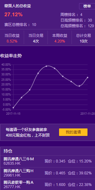虽然收盘变化不大,但是盘中巨震让很多选手的收益严严实实做了回过山车。然而,面对连续几天的阴跌,尤其午后的猛烈下跌中,实盘大赛主力区的选手果敢加仓,于今天斩获近10%收益。例如选手“蒙面人”今日收益达8.52%,在权重股下跌过程中,买入腾讯认购窝轮和牛证,令收益大幅增长。