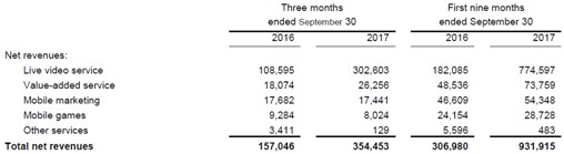 陌陌公布2017年第三季度财报显示,公司净营收为3.545亿美元,同比增长126%,高于分析师预期,其中直播业务占总营收的85.36%,达到3.026亿美元,同比增长179%;每ADS收益0.45美元,高于分析师预期。