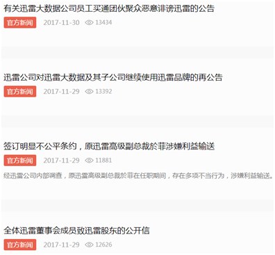 内讧的高潮发生在11月28日上午,迅雷发公告撇清与迅雷大数据及其旗下高风险业务的关系,并成已正式撤销品牌和商标授权,并要求其停止对迅雷商标的使用。