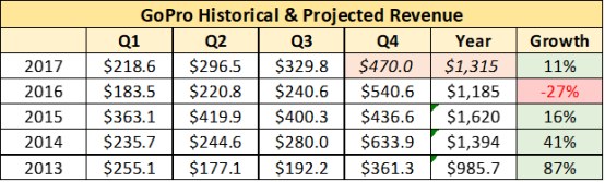 令人沮丧的是,GoPro预计第四季度的收入将达到4.7亿美元(上下浮动1000万美元),这比去年下降了13%,比2014年第四季度下降了26%。根据第三季度财报的数据,预期第四季度收入的下降由于GoPro 6在第三季度发布,已经提前释放了原本在四季度爆发的需求。