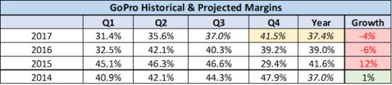 最后一个令我担忧的问题是利润的压缩。GoPro预计第四季度利润率为41.5%,这是好的,但全年依然疲软,据估计为37.4%(按照美国通用会计准则)。这意味着竞争压力和需求下降直接导致利润率连续三年下降。现在,公司不得不将产品的价格降至历史最低水平,并常常被迫在消费者最初想要的时候大幅削减相机价格。