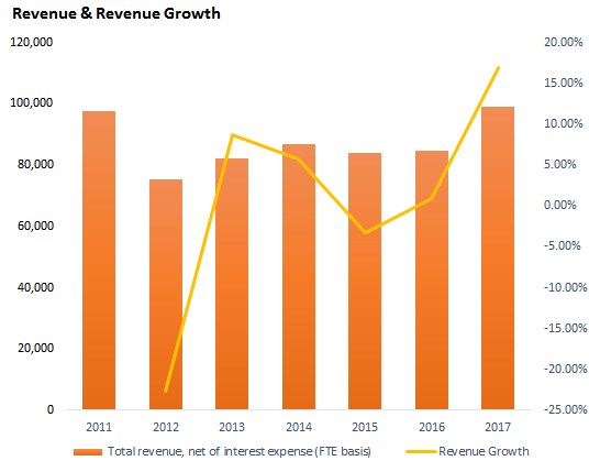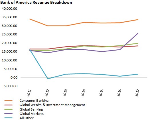 从美国银行(NYSE: BAC)近几年的营收表现来看,公司核心业务似乎并无增长,其他业务也在下滑,但2017年公司营收再次重回增长。过去一年中,投资者情绪向好,公司股价大涨20%。
