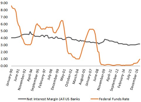 上图展示了美国银行近几年来的年营收情况以及2017年的季度营收情况。从中可见,在美联储加息政策的利好之下,美国银行的营收实现了大幅改善。