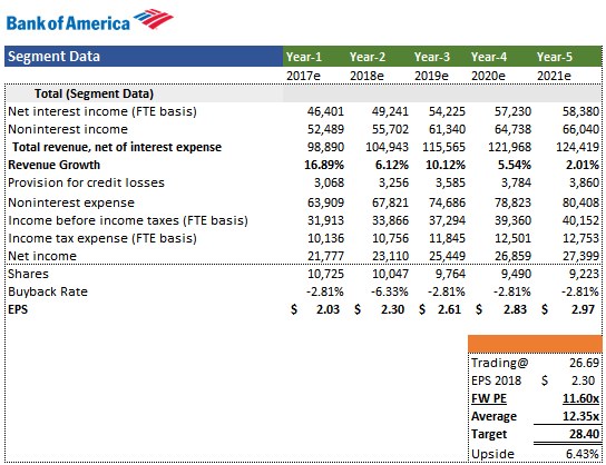 上图的模型分析结果显示,美国银行目标价为28.4美元,比目前的股价高出6.4%。2017年美国银行营收同比增长约17%,上述模型中未来五年的营收增速递减至2%,分析时利润率按照历史水平计算。此外,该模型假设平均股票回购率为2.81%,市盈率按照两年平均市盈率12.35计算。
