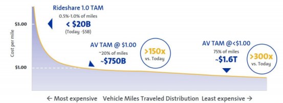 上图通过每公里行驶成本来预测未来共享出行市场的规模。图中AV代表自动驾驶,TAM代表潜在市场规模。