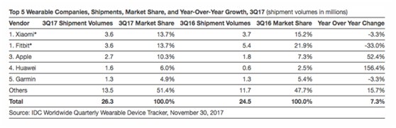 根据IDC的数据,小米和Fitbit第三季度并列成为可穿戴出货量最大的公司。苹果位居第三,出货量270万,但是由于单品价格更高,更有可能成为按营收计的龙头。