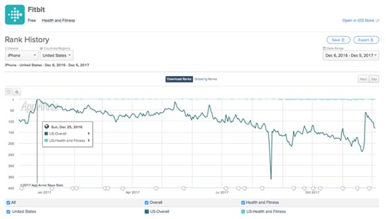 目前Fitbit APP排在健康类别的前五名,经常在假日升至榜首,去年圣诞节在苹果商店的下载量就居于榜首。