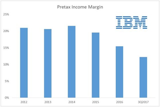 我们可以看到IBM的税前利润率在20%-22%这个区间,2015年和2016年便大幅下滑,今年继续下滑,不过公司百年老企的底子还是有,营收方面不算太差。