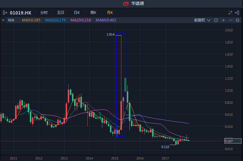 下图中蓝色方框是康宏国际于2015年4月的K线图。月股价振幅为444%,而成交量激增。此前与此后的成交量相比,几乎是忽略不计。此后,成交量忽大忽小、股价则是一路走低。