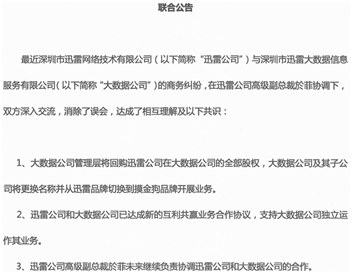 此前,迅雷内部宫斗,随着两家公司联合发布声明,最终以双方“分手”告终。声明称,迅雷与迅雷大数据已消除误会,达成共识,迅雷大数据将回购迅雷在迅雷大数据的全部股权,并且迅雷大数据将会改名,从迅雷品牌切换到摸金狗品牌开展业务。