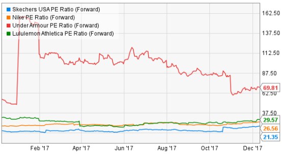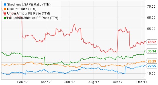 今年以来,斯凯奇股价累涨48%。上次财报发布后,公司股价上涨超过50%,这使得公司一跃成为2017年表现最佳的运动零售股。也许有人会说这只是昙花一现,但笔者却认为并非如此。斯凯奇不仅在行业内股价增速最快,同时估值处于行业最低,预计公司未来还有上涨空间。