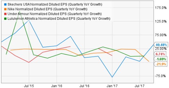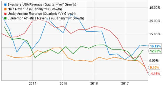 接下来看斯凯奇的基本面。公司2017财年第三季度营收和利润增速为同行中最快。斯凯奇2016财年的年营收创下纪录新高,又在接下来的2017财年前三个季度中的每一季度都创下季度营收记录。斯凯奇今年第三季度的营收大增16.2%,并且公司预计下一季度的营收将继续保持中双位数增长,这样的业绩增速超过其他同行。