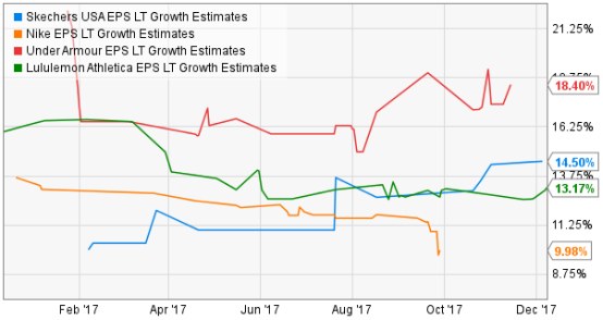 首先来看公司估值情况。无论从滚动市盈率还是远期市盈率来看,斯凯奇的估值都远低于其他同行。安德玛(NYSE: UAA)、耐克(NYSE: NKE)和露露柠檬(NASDAQ: LULU)的平均滚动市盈率为35,比斯凯奇22.5的滚动市盈率高出一半不止。同行中滚动市盈率最低的是耐克,而耐克历史市盈率也比斯凯奇的高出17%以上。