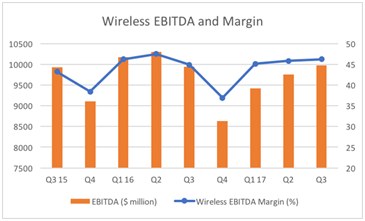 另一个利好因素是无线业务分部EBITDA利润率的提升。如下表,连续三个季度利润率均有所提升。第三季度高达46.2%的EBITDA利润率相比上年增幅为1.3%。同样,第三季度EBITDA为99.69亿美元也稍高于去年同期的99.34亿美元。