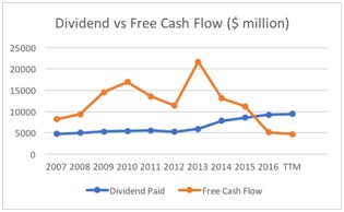 公司当前股息为每股0.59美元,按当前的股价53.2美元计算,则股息率约为4.5%。年前公司曾将股息从0.5575美元上调2.1%,增速一般,并且过去十年间持续下滑。未来公司将持续上调股息,只不过幅度并不大。从下表可看出,公司过去12个月自由现金流从最高200亿美元跌至50亿美元,当前12个月派发的股息94亿美元几乎是自由现金流46亿美元的两倍。