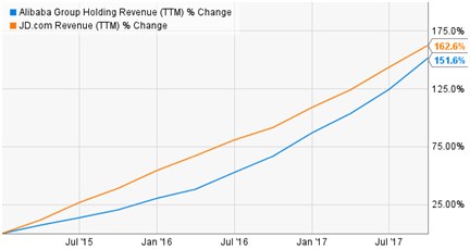 尽管两家公司的背景和策略不同,但是凭借庞大的用户数据,二者都开始对中国的物流产业开始进行整改,并且对数百万家便利店进行现代化改造。两家公司在过去三年期间,收入增长表现良好,其中,京东达到162.6%,阿里则为151.6%。