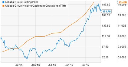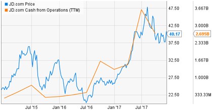 在TTM的基础上,阿里的运营现金流较2015年增长了3倍;而京东则表现更好,增长接近了10倍,并且大部分增长是在2016年中期开始,虽然前期表现不佳,有所回落,但最终公司实现现金流和股价的反弹。