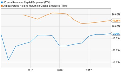 在资本回报率ROCE方面,京东则表现不佳,但是正如上文所说,公司主要将其投入到自营物流体系的建设,虽然为负,但是自2015年以来已经开始持续改善。
