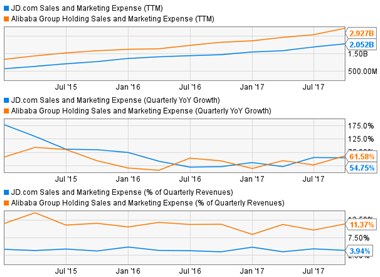 关于京东是否会被更大的阿里压制,一直都在争论,但是两家公司的业务并不是完全重叠,而且从消费者方面,二者也都没有为了争夺市场份额而进行有害消费者的行为。从销售和营销费用方面,两家公司都是稳步上升,并且从该费用在季度收入中的占比可以看出,两家公司都没有进行激烈的竞争。