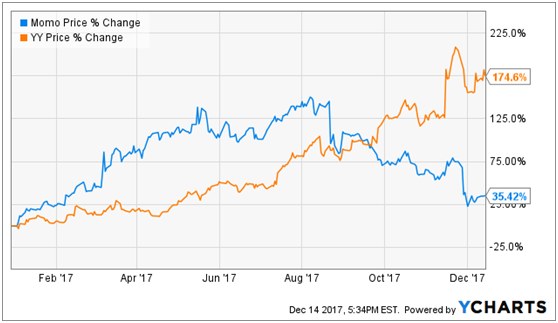 过去5年,两家都是中概股里出类拔萃的股票。虽然前期陌陌比yy涨得更好,但今年以来,yy基本还在上升趋势,而陌陌却大幅回撤了。