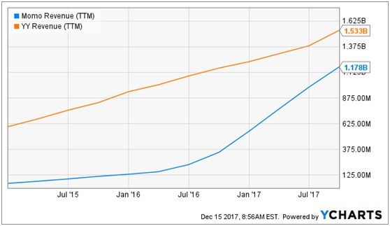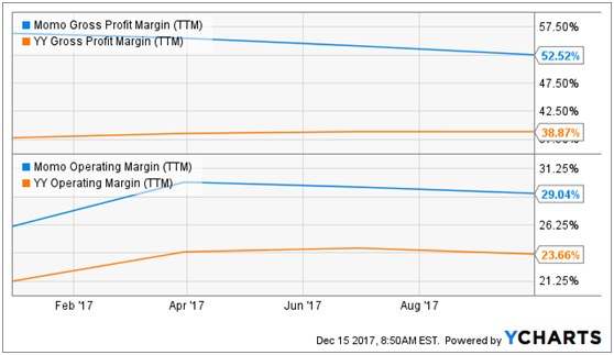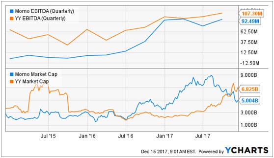 从下图可以看到就EBITDA来说,陌陌几乎赶上YY了,考虑到市值的大小,相对而言,陌陌已经追上了。