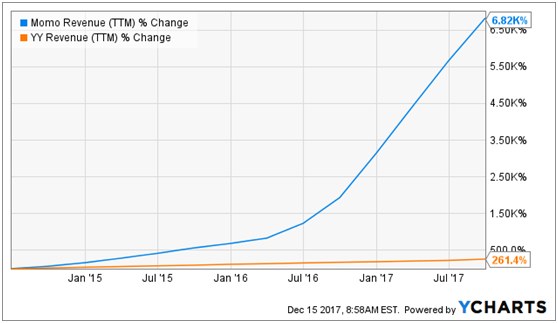 成长性:yy增速很稳定,yy呈现加速的趋势,无论是过去5年还是今年,陌陌的成长都快于YY。