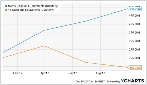 不过虽然数量没有上升,但是人均花费有增长,增值服务从450万增长到480万。公司的现金头寸不断上升。截止今年9月30日,陌陌的现金及等价物总计9.5亿美元,前一季度则为8.5亿美元,而去年同期为6.5亿美元。