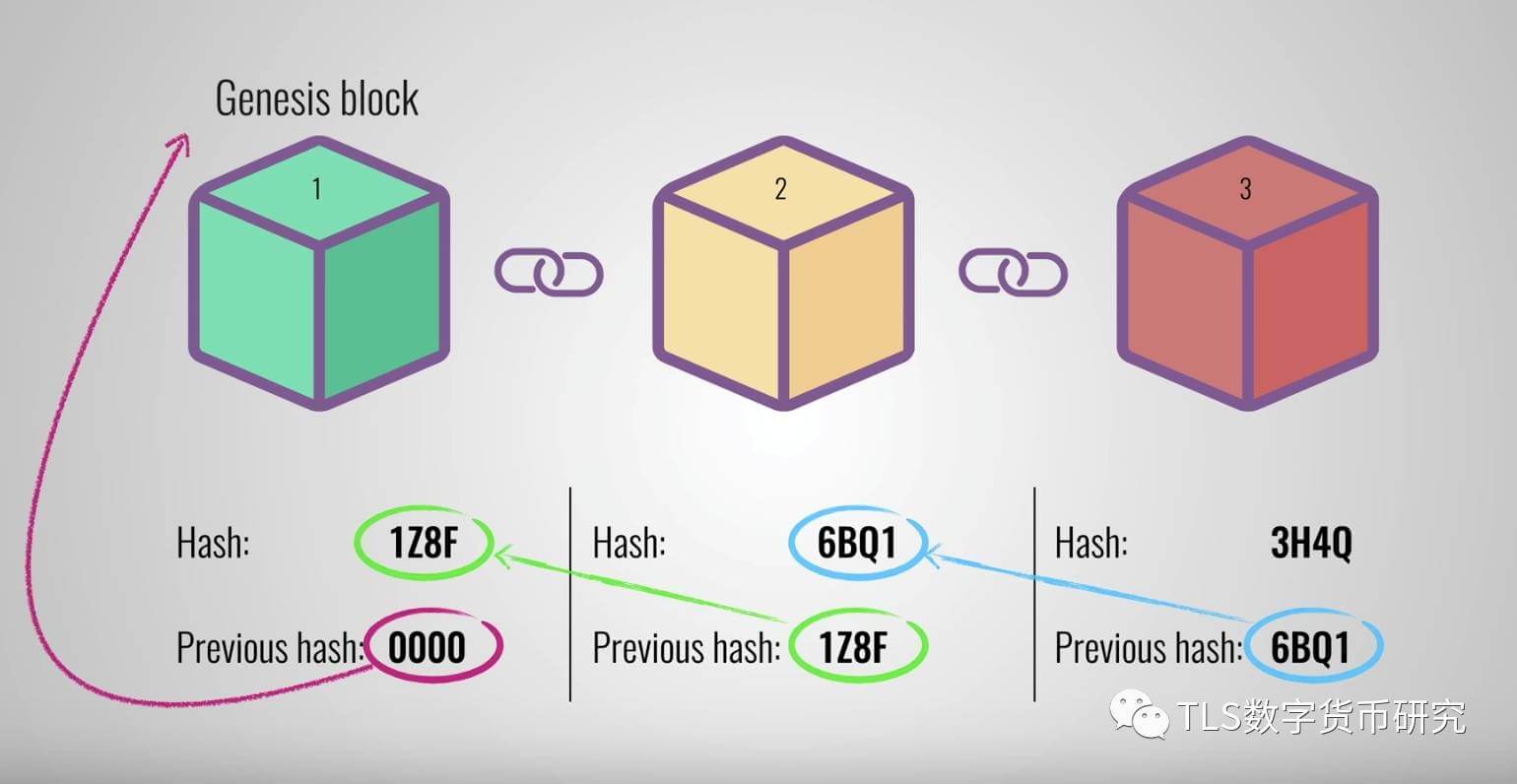 举个例子,比如我们有一个包含三个区块(1,2,3)的区块链,每个区块都有该区块的哈希和它前一个区块的哈希。区块3指向2,然后2指向1. 第一个区块由于没有前一个,一般称为源区块。