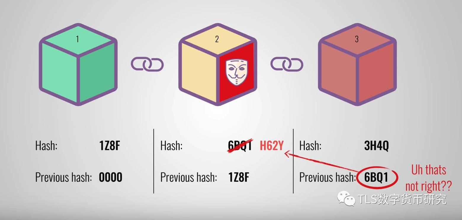 这种设计,使得区块链的安全性极大的增加。举个例子,假如你要篡改其中一个区块(第二个),那么由于第三个的前一个哈希和现在的第二个的哈希不同,导致第三个区块失效,依此类推,后面所有的区块都会一起失效。