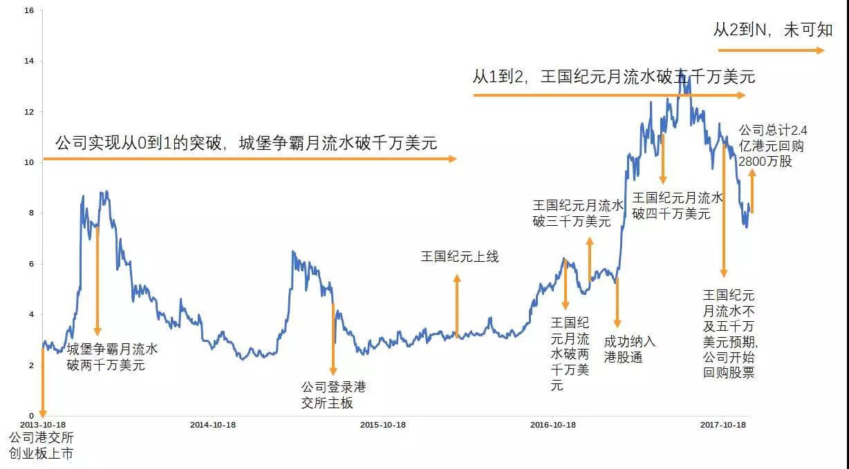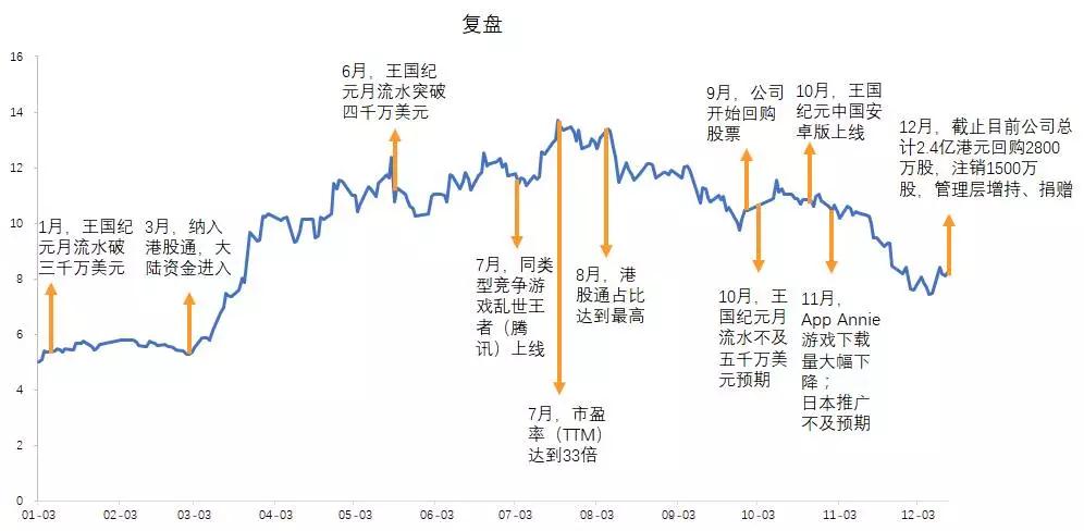 2017年,王国纪元分别在1月、6月突破三千万美元和四千万美元流水,预计12月突破五千万美元流水。3月,公司纳入港股通标的。北上资金南下,公司估值和盈利齐升,形成戴维斯双击,股价一路突飞猛进。但随着竞争加剧、业绩不及预期、大陆资金获利了结等事件影响,公司股价从高点一路下跌,就算公司不断回购股票也无济于事,目前股价在8港元左右震荡。