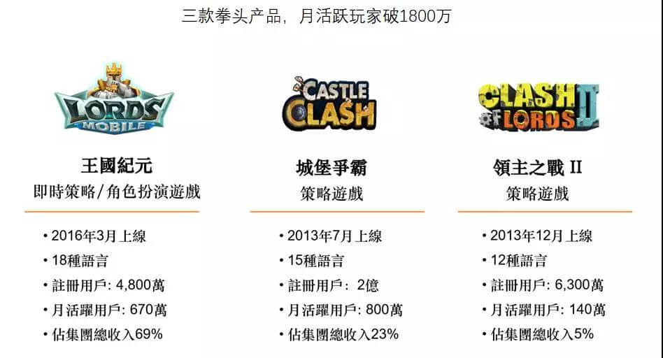 分产品来看,总营收的69%、23%及5%分别来自王国纪元、城堡争霸、领主战争。