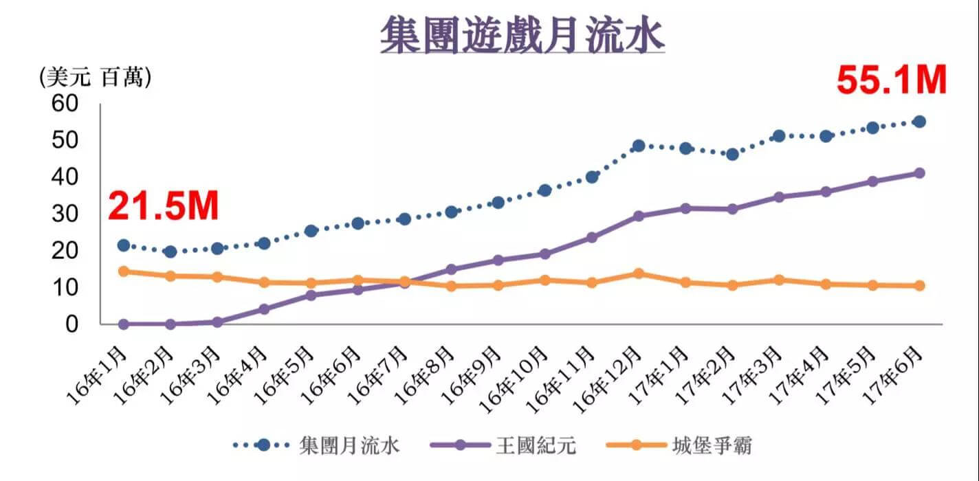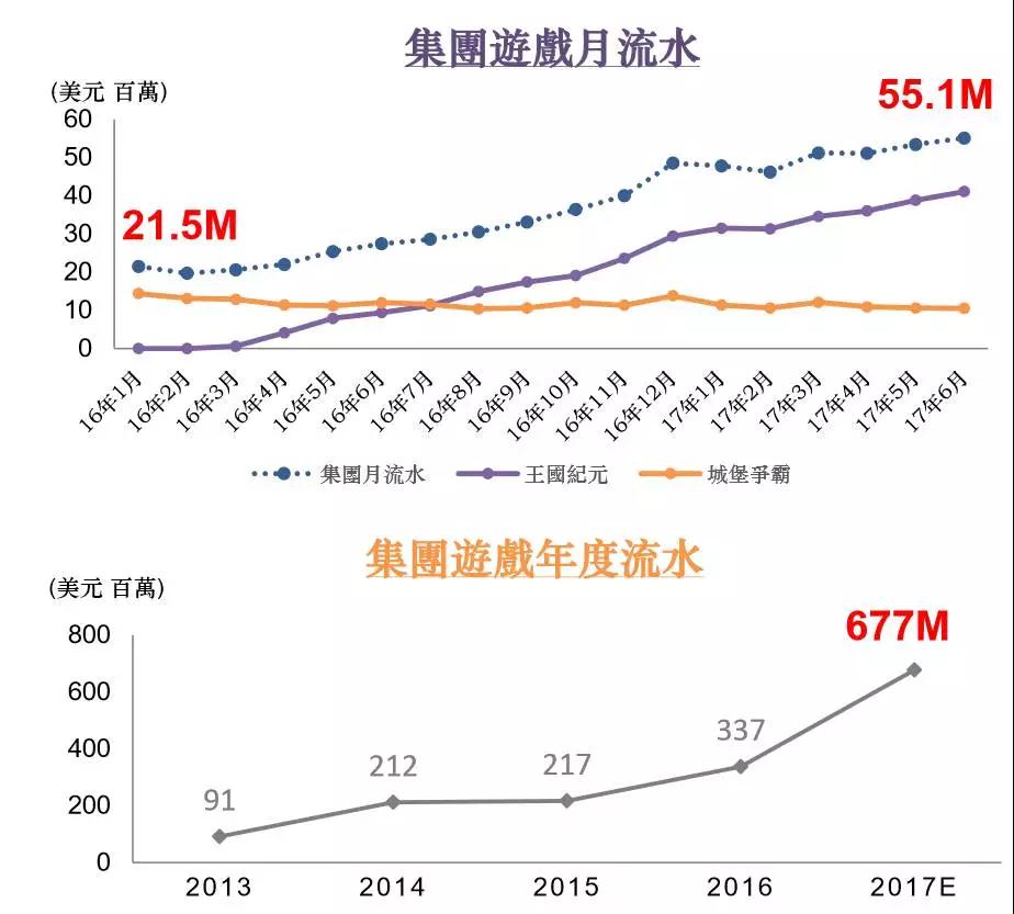 其中,王国纪元月流水呈稳定上升态势,预计2017年12月份将突破5000万美元月流水。城堡争霸2013年7月上线,截止2017H1,依然贡献月均11百万美元流水。