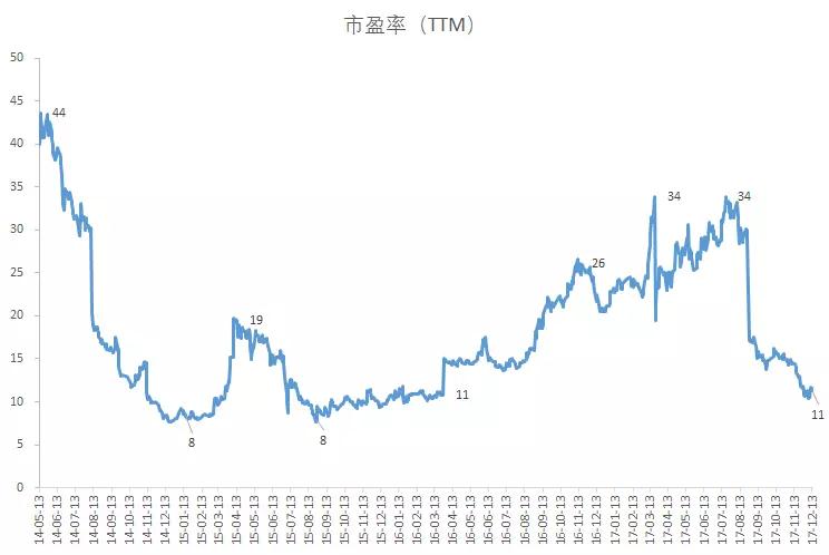 从2016年3月至2017年8月,公司市盈率处于攀升状态,最高涨至34倍。2017年8月至12月,公司市盈率迅速跌回至上涨前水平,目前仅有11倍。