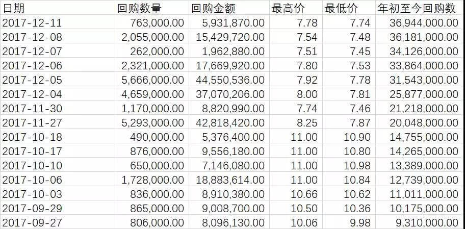 从2017年9月27日~2017年12月11日,公司管理层积极回购股票。