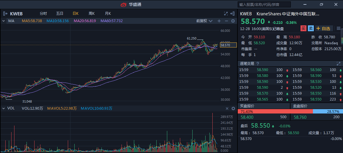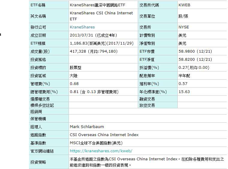 KraneShares CSI China Internet ETF(KWEB.US),中文名称为沪深中国网络ETF,成立于2013/07/31,在NYSE交易所交易,其主要投资地区为大陆,投资目标为股票型,基金所追踪之指数为CSI Overseas China Internet Index,在扣除各种费用和支出之前追求达到和指数一样的投资表现。