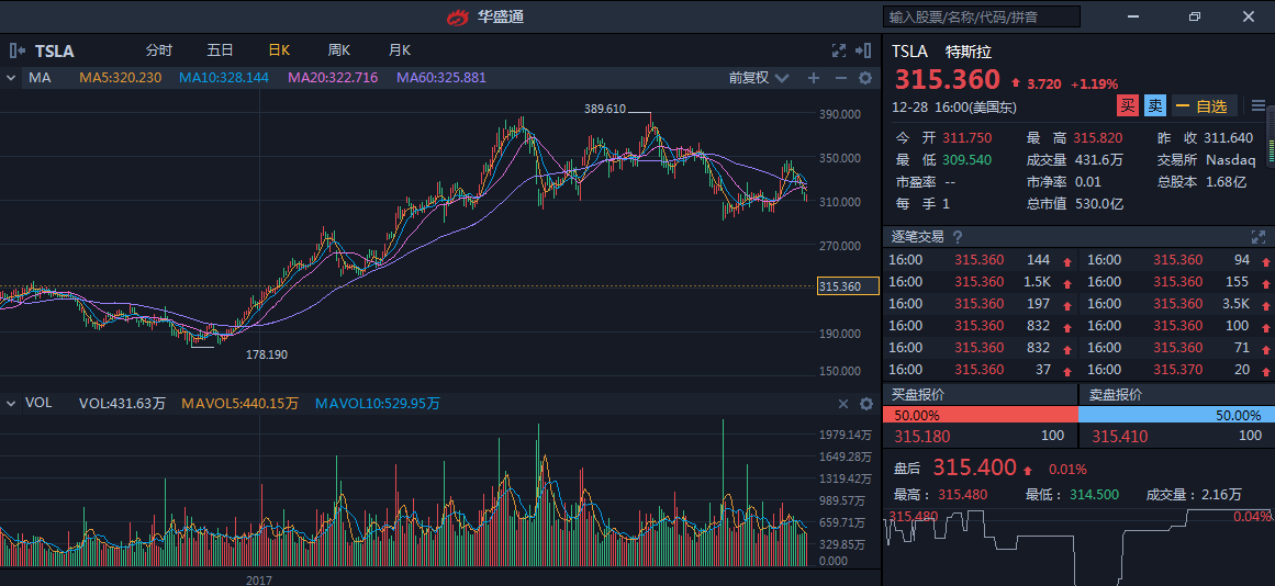 但是Tesla却面对很多问题, 例如产量常设定很高, 但又未能达到, 而且现在很多竞争, 很多对手陆续推出电动车智能车那些, 有可能使TESLA面对很多挑战, 所以估计400美元的大关很难冲破, 如果真冲破了需要再检讨其基本因素是否转好, 但更大机会是在上落区间行走, 甚至有些分析师认为冲上400美元后有可能再下跌到200美元, 因此2018投资TSLA应小心, 尽量在此区间低买高卖, 跌穿290美元需谨慎,290元可以试试, 但跌穿这价位就要小心啰, 因为这区间走得蛮久了。