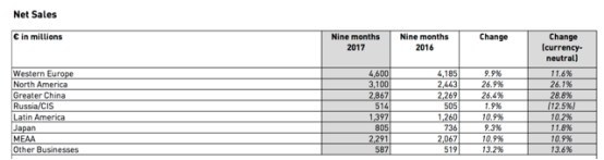 阿迪达斯在国际业务的大部分地区都能保持增长,中国和北美是增长最快的地区: