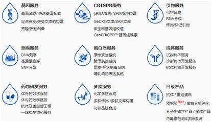 公司提供生命科学研究产品和服务,致力于高通量和高质量的生物学研究服务,包括基因合成,分子生物学服务,多肽合成,定制抗体,蛋白表达,抗体及蛋白质工程以及体外和体内药效学研究,主要分为生命科学研究服务、生命科学研究目录产品、临床前药物研发服务、工业合成生物产品。
