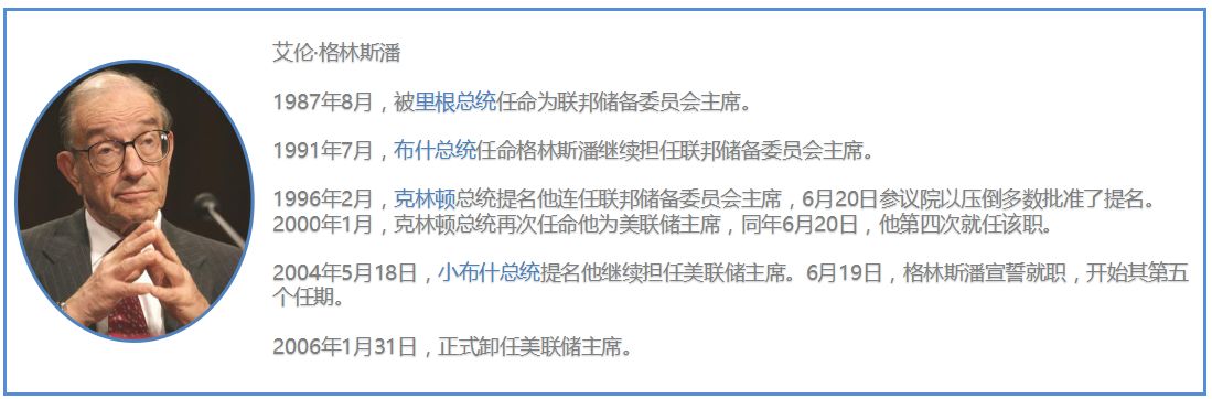 我刚刚来到华尔街工作的时候,正值格林斯潘主席在临近他担任美联储主席的最后时间。格林斯潘老先生从1987年接任美联储主席,一共18年,直至2005年宣布退休,不再连任。