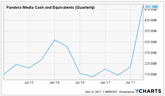潘多拉的现任CEO是Roger Lynch,此人曾经担任顶尖的互联网收费电视服务公司Dish Sling电视台CEO,且曾在上世纪90年代末担任互联网流量大户Broadcast.com首次公募的银行家。Lynch在潘多拉面临重重困难和挑战的时候选择加入。今年潘多拉的前任CEO Tim Westergren离职,公司剥离出售2015年收购的票务公司TicketFly,卫星广播公司SiriusXM向潘多拉投资4.8亿美元。如下图所示,2017年年中开始,潘多拉的现金和现金等价物一路飙升。