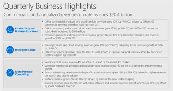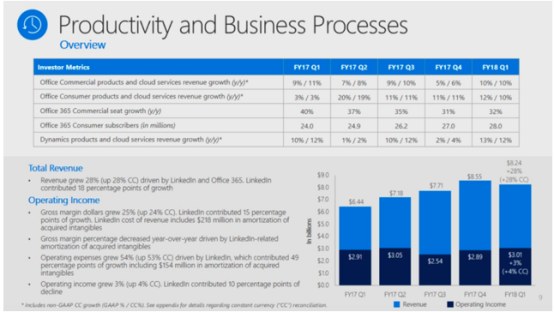 今年微软的office等传统产品线业绩表现出色,营收继续保持两位数增长,零售使用数量和利润均实现增长。