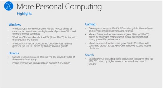 微软的手机、笔记本电脑等非软件产品营收增速不如office产品,其中部分产品营收甚至略有下滑。不过总的来说,微软的传统业务营收实现了稳步增长。