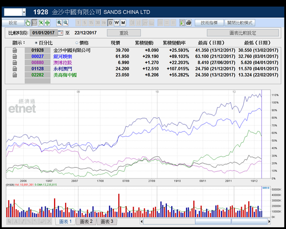 正如过去一直强调,强者越强的情况预期会成为市场的新常态,亦很大可能在可见的将来持续下去。而在今年表现亮丽的澳门赌业股,相信情况亦有望在2018年延续。下图是几只主要在香港上市的澳门赌业股今年以来的股价表现,金沙中国的股价除了稍微跑赢澳博控股之外,其股价明显大幅跑输其他同业。而与其市场地位相若的银河娱乐,年内股价升幅更是其3.5倍之多,可见金沙中国有大幅度追落后的空间。